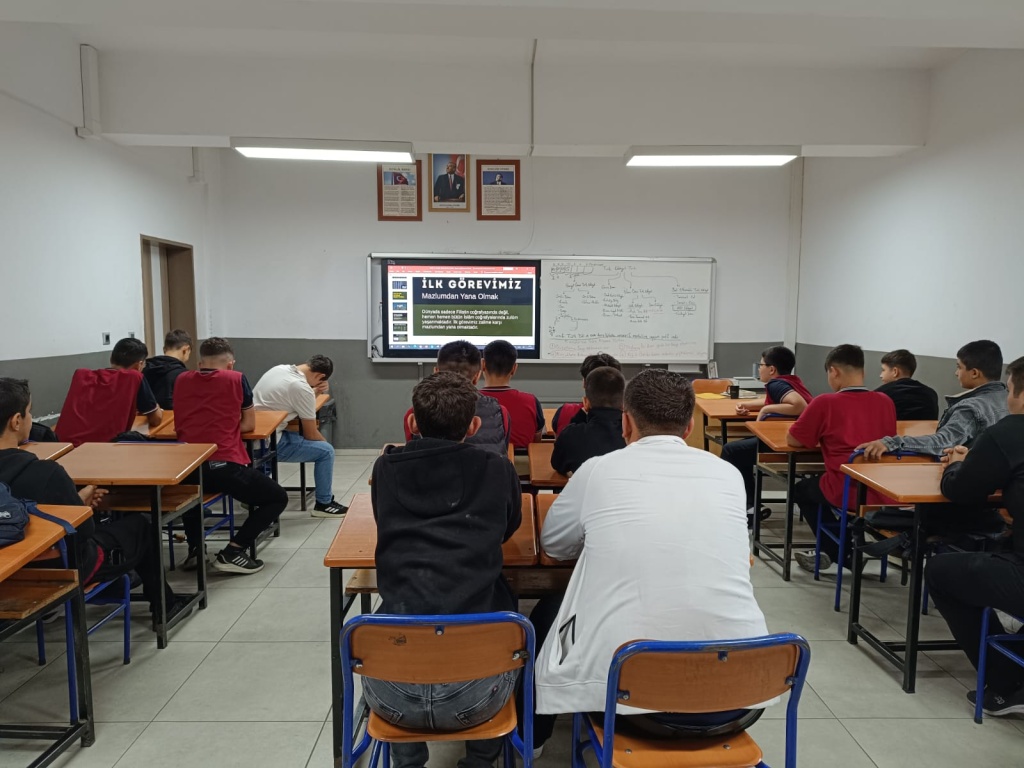 Milli Eğitim Bakanı Yusuf Tekin, tüm okullarda öğrencilerin katılımıyla eş zamanlı olarak Filistin ve Gazze temalı farkındalık etkinlikleri düzenleneceğini bildirmesi üzerine okulumuzda da konuyla ilgili çalışmalar yapıldı.