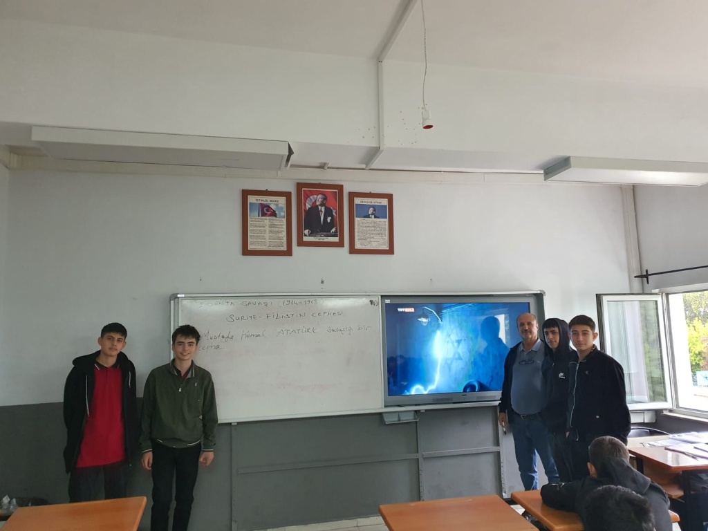 T.C.İnkılap Tarihi ve Atatürkçülük dersinde konumuz I.Dünya Savaşı Savaştığımız cephelerden birisi Suriye-Filistin idi. Bugün bu coğrafyada Gazze'deki İsrail vahşetine dünya seyirci,Türk gençliği olarak bunu kınıyoruz. Ecdat yadigarı bu topraklarda yeniden barış,sükunet ve istikrarın sağlanmasını gülen,oyun oynayan,okula giden çocukların olacağı günlerin bir an önce gelmesini istiyoruz.